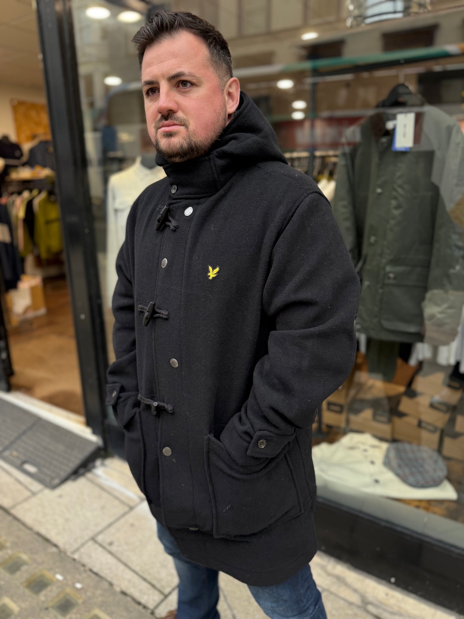 The Lyle & Scott Duffle Coat in Jet Black delivers classic design and lasting quality. Made from a durable wool blend with traditional toggle fastenings, it’s lined for extra warmth and finished with subtle branding — a smart choice for everyday wear through the colder months.